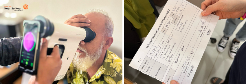 (Left) Fundus examination for diabetic retinopathy screening / (Right) Referral card for patient transfers between NCD Corner and Eye Center.