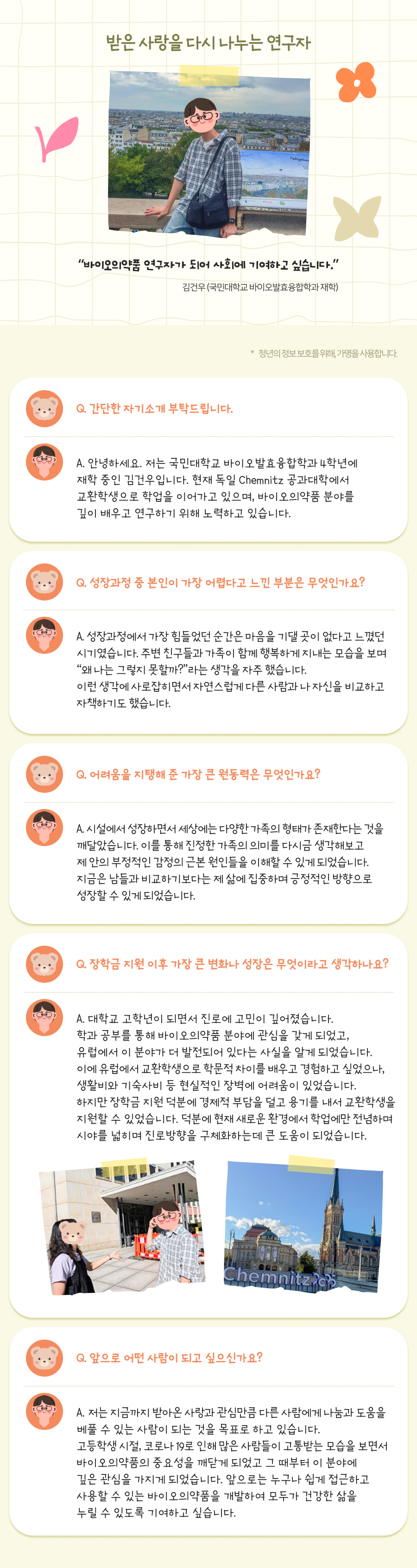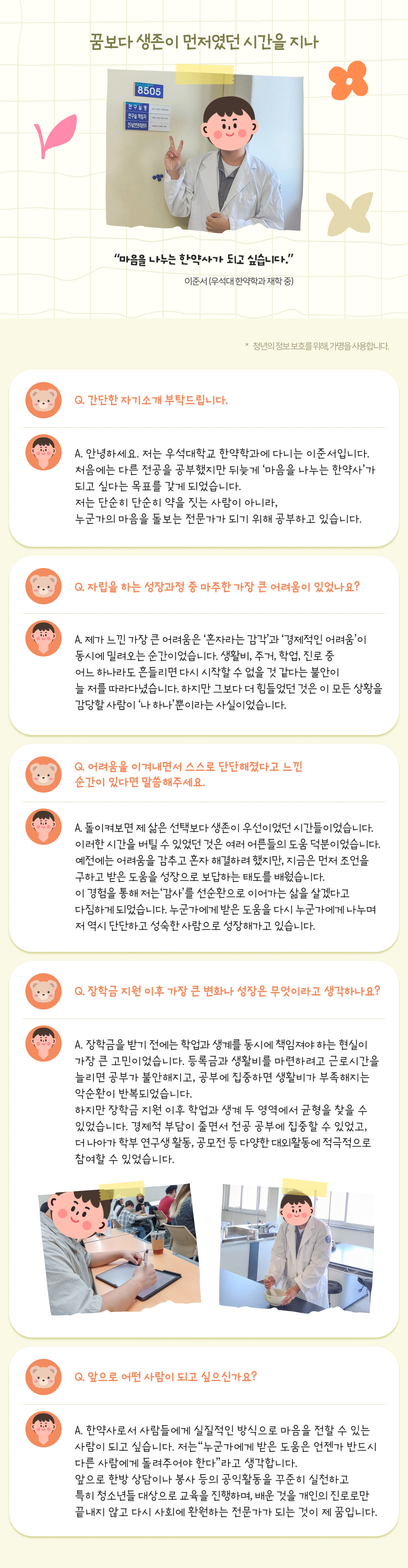 ‘후원문의’를 통해 입력한 개인정보는 후원과 관련된 질의분석 및 통계자료로 활용될 예정으로 최대 3년까지 보관되며, 보존기간이 만료되었을 경우 즉시 파기를 진행합니다. 또한, 이용자가 ‘게시판 운영주체’에게 본인의 개인정보 삭제 요청 시 지체 없이 삭제를 진행하고 그에 대한 결과를 통보해 드립니다.