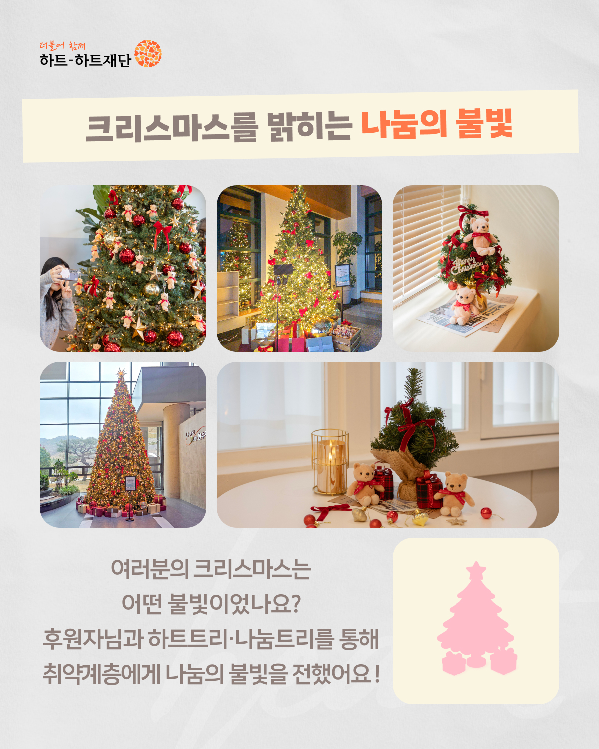 하트-하트재단에서는 매년 취약계층을 지원하는 ‘하트트리‘ 캠페인과 ‘나눔트리‘ 캠페인을 진행하고 있어요.
