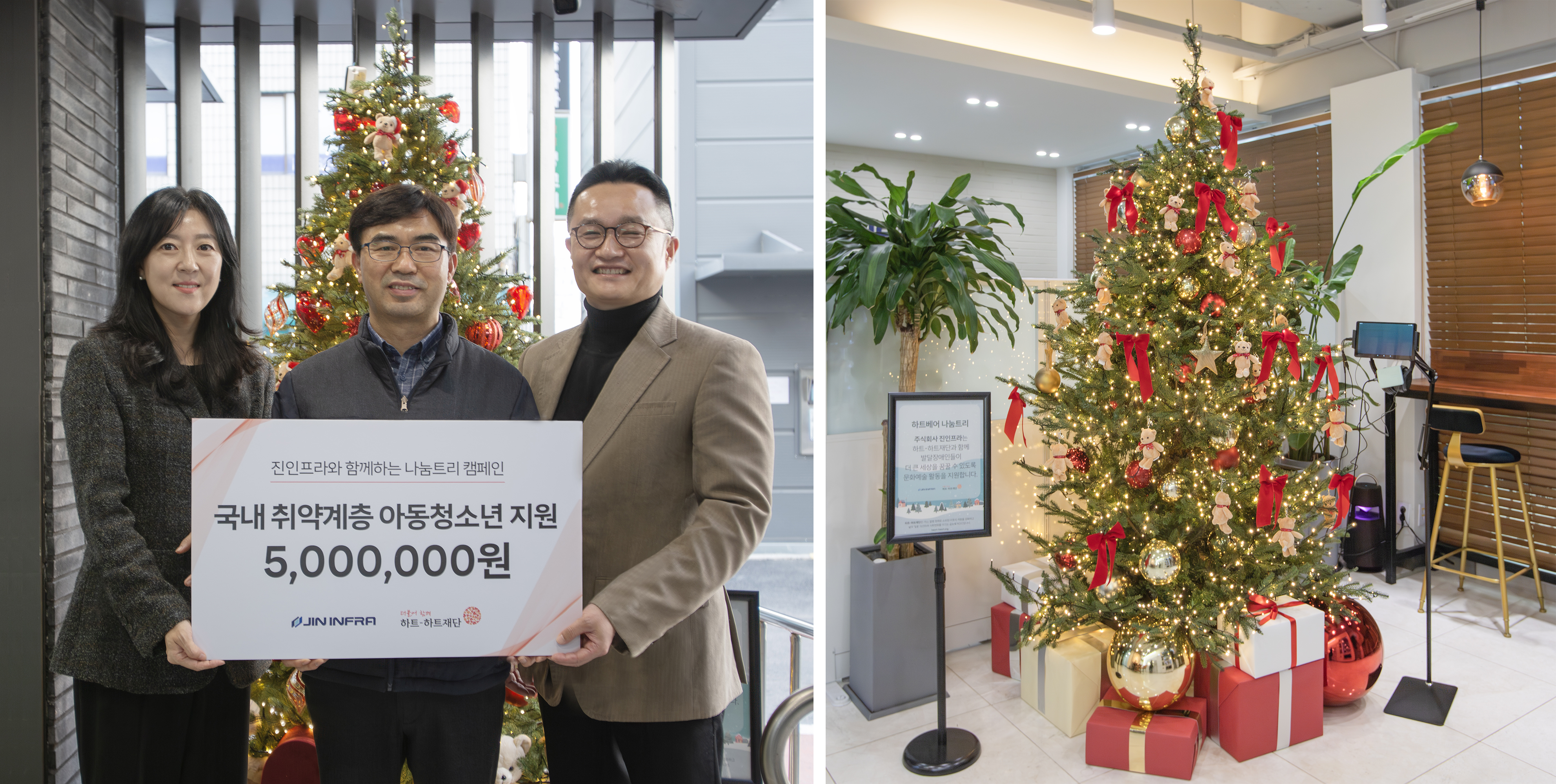 이번 캠페인을 통해 조성된 기금은 국내 취약계층 아동·청소년의 생계·교육 지원과 희귀난치질환 아동의 의료비로 사용될 예정이며, ㈜진인프라는 로비에 설치된 트리를 통해 희망과 응원의 메시지를 전하였다.