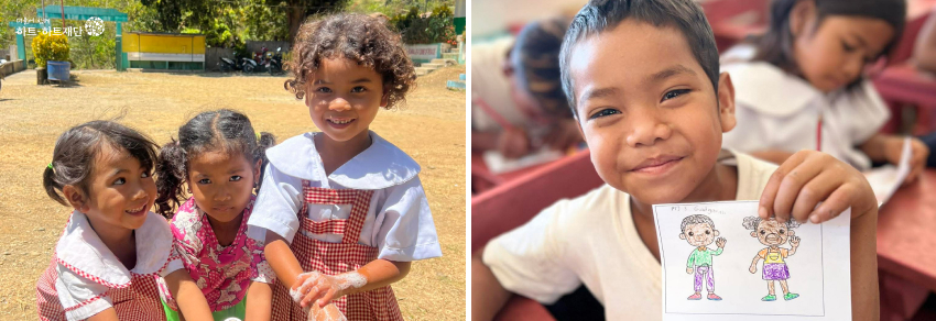 (L) Children washing their hands / (R) "A child participating in the ‘Body Part Coloring‘ activity"