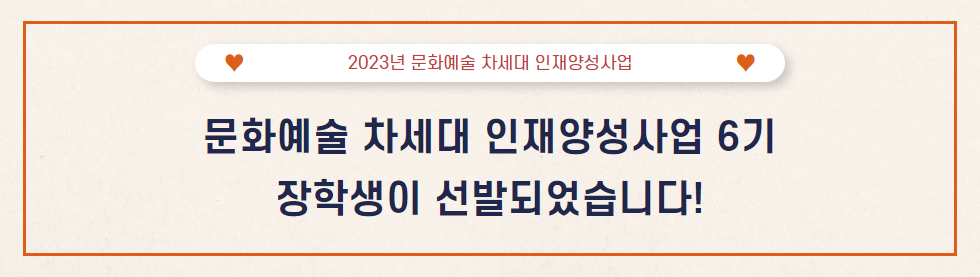 문화예술계의 차세대 인재로 성장할 수 있도록 돕고자 <문화예술 차세대 인재양성사업>을 실시하고 있습니다.