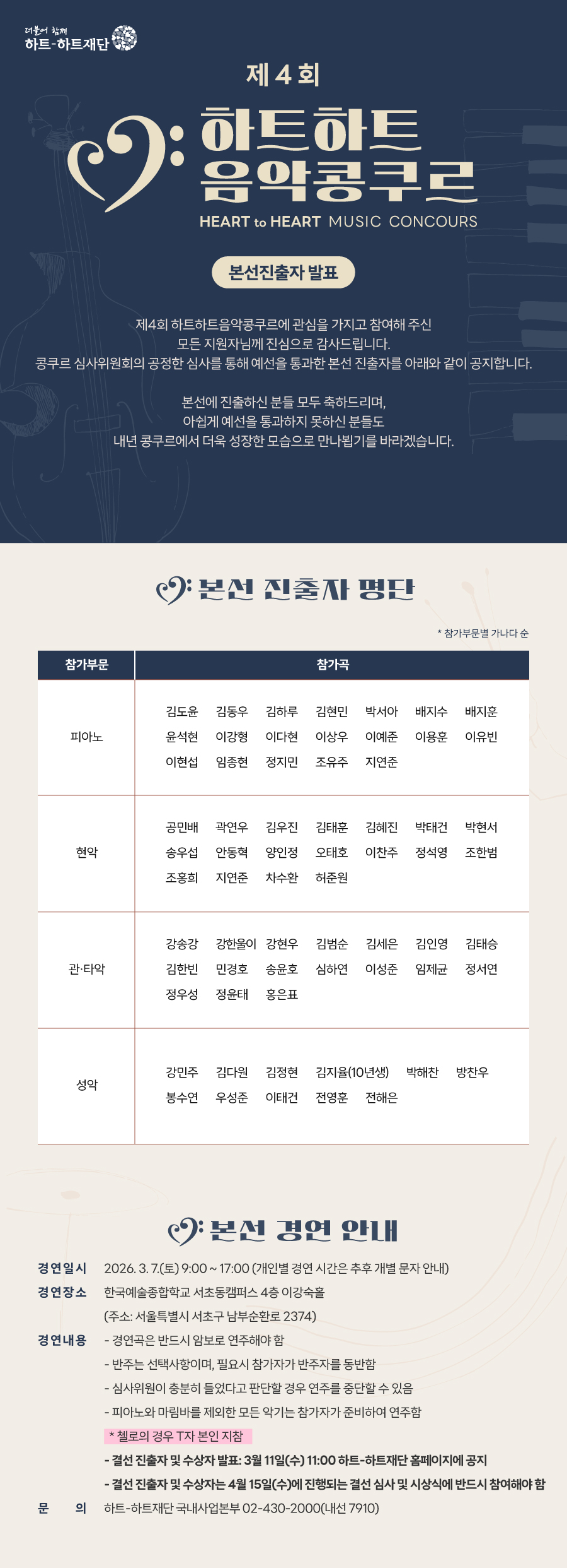 제4회 하트하트음악콩쿠르에 관심을 가지고 참여해 주신 모든 지원자님께 진심으로 감사드립니다.