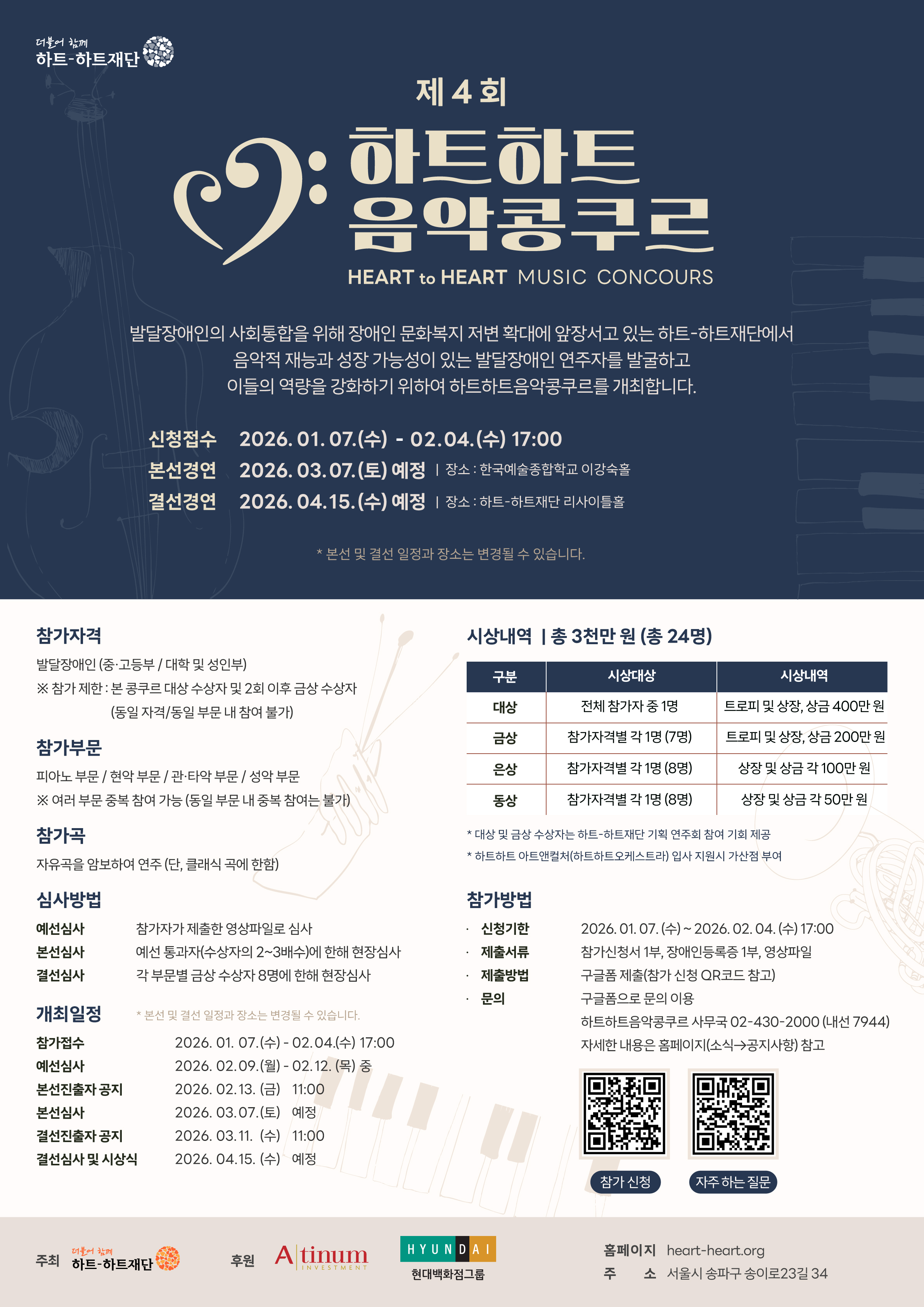 이번 콩쿠르는 중·고등부와 대학 및 성인부의 발달장애인을 대상으로 하며, 참가 부문은 △피아노 △현악 △관·타악 △성악으로 나뉜다. 참가 신청은 1월 7일부터 2월 4일까지 하트-하트재단 홈페이지를 통해 가능하다.